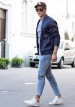 スエード&レザーで高級感をプラス。定番のナイロン素材よりも「落ち着いた表情」に仕上がるスエード素材のMA-1コーディネート。 合わせるアイテムもネイビーパンツにブルーシャツと、普通のMA-1と同じように使用可能。ですので少し大人っぽい雰囲気に仕上げたい、そんな場合に活躍しそうですね。 足元はグレーのレザースニーカ…