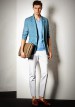 青ジャケット×白パンツのコーディネート