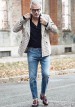ベージュダブルジャケット×ジーンズ×ローファーの着こなし