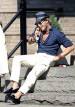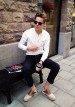 正統派の紺ジャケに白パンを合わせた、若干アメトラを思わせるコーディネート。 インナーのブルーシャツが全体的な着こなしとマッチしている点も魅力的。 白パンはあえて”くるぶし丈”やロールアップしてるところもシャレている。 さらにお決まりの伊達メガネと、もうバリバリのアメトラで…